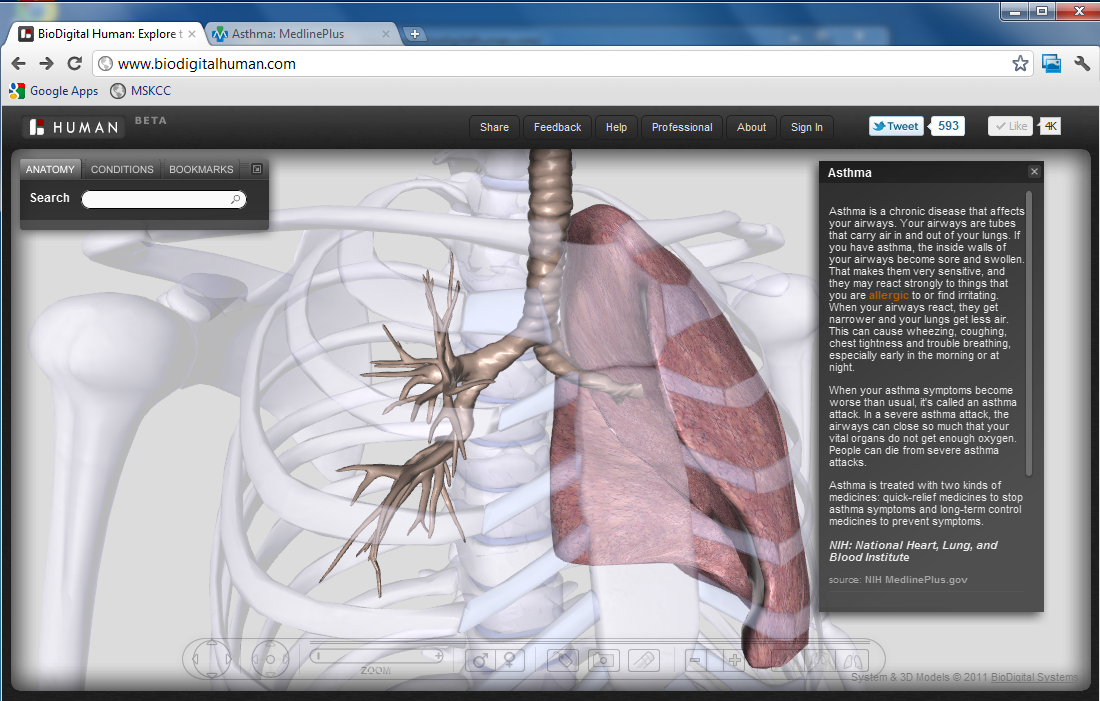 The BioDigital Human is an online 3D platform for exploring anatomy, physiology and disease. At the most basic level, the BioDigital Human serves as an interactive tool to study human anatomy. When combined with MedlinePlus Health Topics and simulated models of disease and treatments, it functions as a powerful way to visually communicate medical subjects.